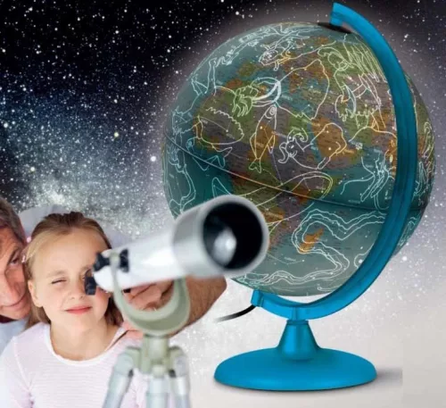 Különleges kettő az egyben világító gömb, mely alapállapotban a Föld országait mutatja be, kivilágítva pedig az éjszakai égbolt izgalmas csillagképeivel ismerteti meg a gyerekeket. A földgömb országonkénti színezésben mutatja be az aktuális határokat, így jól használható a földrajzi ismeretek bővítésére. Sötétben, felkapcsolva a földgömbben lévő izzót, megjelennek a csillagképek latin névmegírással és színes illusztrációkkal. A földgömb éjszakai fényként is használható.