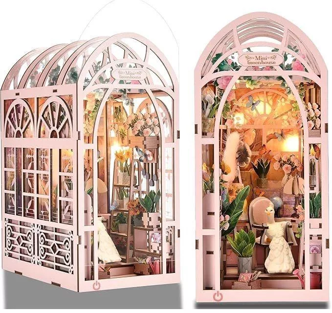 A Pink üvegház könyvtámasz olyan, mintha a polcod egy titkos üvegház rendezett mini oltárává válna.A pink üvegablakos házikó struktúrája letisztult eleganciát sugall, amelyen keresztül bepillantást nyerhetsz egy aprólékosan megkomponált “kerti szentélybe” – tele miniatűr növényekkel, virágzó kellékekkel és kecses kerti bútorokkal. A fehér páva mosolyogva pihen a széken, várva, hogy megjelenj.A meleg, fényes LED-világítás nemcsak életet lehel a jelenetbe, de estefelé igazán megnyugtató, hangulatos atmoszférát is teremt.