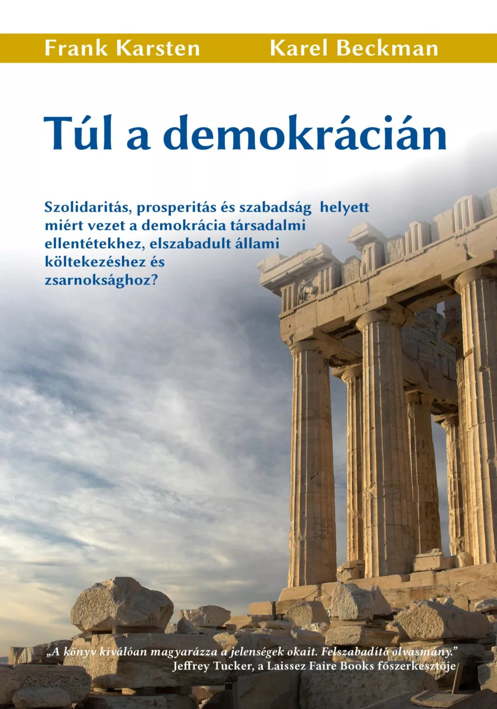 A szerzők szerint a demokráciát az emberek túlnyomó többsége a lehető legjobb politikai rendszernek tartja. Nem túlzás azt állítani, hogy a demokrácia egyfajta világi vallássá, a Föld legnagyobb politikai hitévé vált. Könnyen a civilizált társadalom ellenségének nyilváníthatják azt, aki kritizálja a demokráciát. Azonban mégis ez az a feladat, amire Karel Beckman és Frank Karsten vállalkozott. Rendkívül olvasmányos, provokatív könyvükben vitába szállnak az utolsó fennmaradt politikai tabuval, miszerint üdvösségünk kulcsa a demokrácia.Egyszerű, közérthető érvekkel mutatják be, hogy a közhiedelemmel ellentétben a demokrácia nem a szabadság, a civilizáció, a jólét, a béke és a törvényesség záloga, hanem éppen ellenkezőleg: az egyéni szabadságjogok csorbulásának, a társadalmi konfliktusok erősödésének, az állami kiadások egekig szökésének és az életszínvonal csökkenésének az oka.Megcáfolnak 13 olyan mítoszt, amellyel általában védeni szokták a demokrácia intézményét. Emellett vonzó alternatívát is kínálnak: az egyéni szabadságjogokon és az önkéntes társadalmi kapcsolatokon alapuló társadalmi berendezkedést.Nem érti, miért nő egyre inkább az állam mérete, miért emelkedik az államadósság, miközben a szabadságjogai és a jóléte egyre inkább veszélybe kerül? A könyv elolvasása eloszlat minden kétséget, tudni fogja mindez miért történik, és hogy mi a megoldás.A Túl a demokrácián rendkívül érdekes, úttörő munka mindazok számára, akik jobban meg kívánják érteni a jelenleg tapasztalható társadalmi problémák és a gazdasági válság okait.